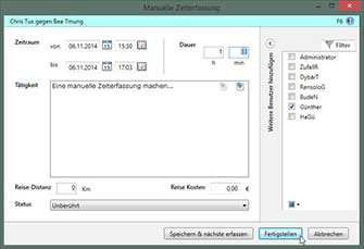 Das nachträgliche Zeiten erfassen ist für timeSOS kein Problem. Sie erreichen die Funktion im Hauptfenster und in "Zeiten bearbeiten". Je nach Berechtigung ist auch die Erfassung von Zeiten für andere Benutzer möglich.