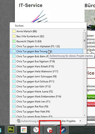 Es geht auch ohne Hauptfenster. Egal wo Sie sind, klicken Sie auf das timeSOS-Schnellaufzeichnungs-Icon in Ihrer Taskleiste um für das nächste Projekt zu erfassen oder eine Aufzeichnung zu beenden.